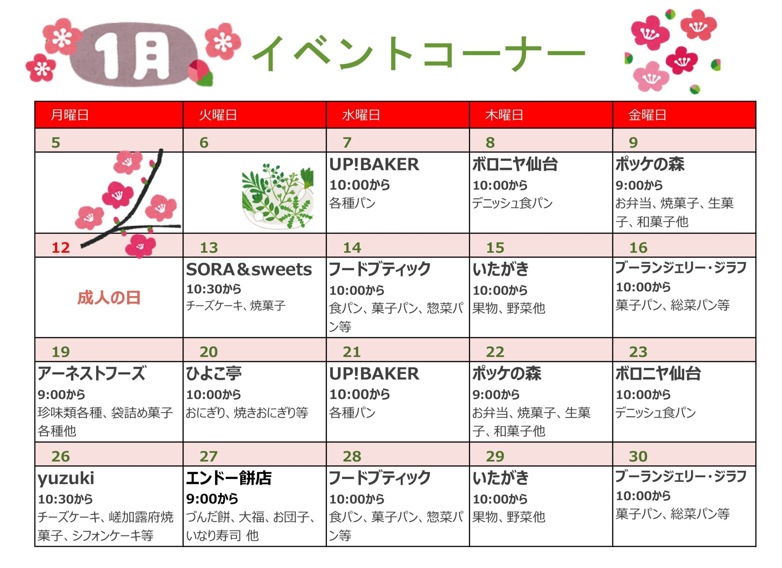 (イベントコーナー)1月の出店予定